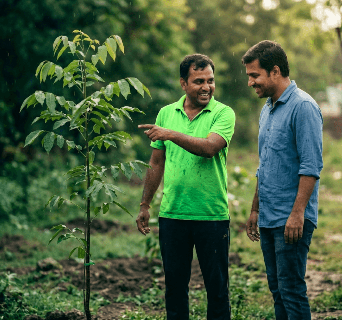 We source 3–5-year-old mature saplings from Rajahmundry, nurture them at our Thuligal Nursery in Kangayam, and plant them.